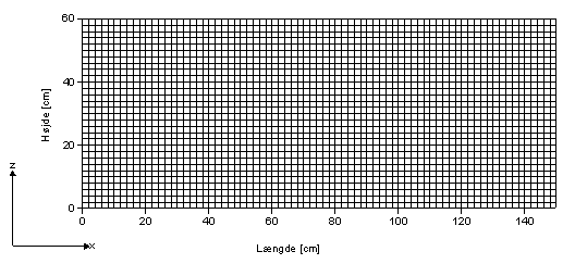 Sandkassen har en længde på 150 cm og en højde på 60 cm. Diskretiseringen af sandkassen er udført med en værdi på 2 cm i henholdsvis vertikal og horisontal retning. Det betyder, at sandkassen er opdelt i 2250 kvadratiske bokse. Diskretiseringen af sandkassen ses på Figur 1.