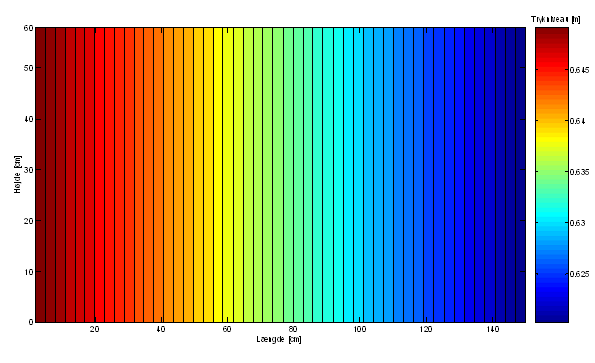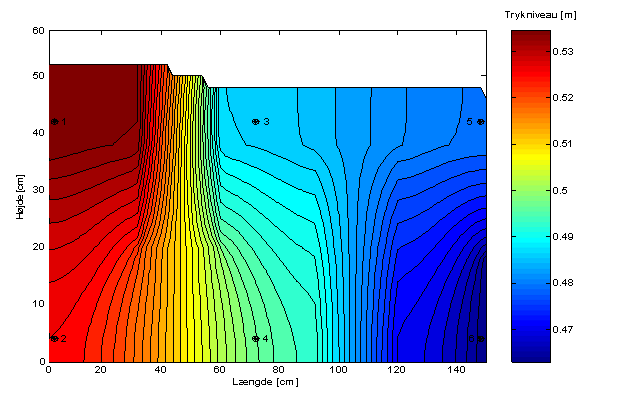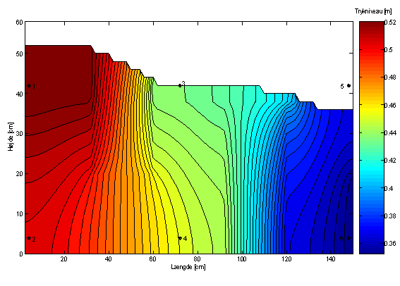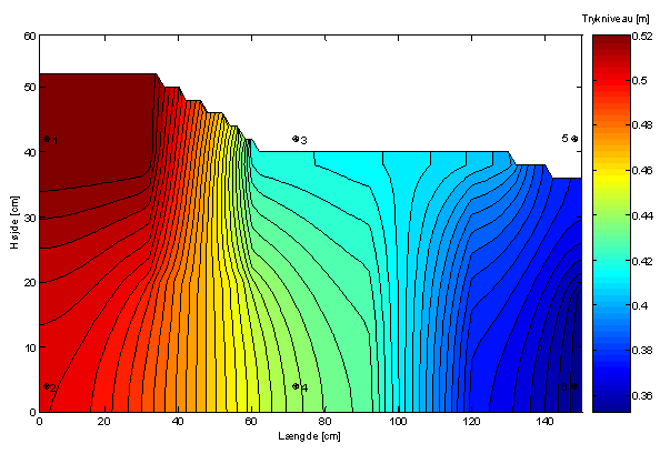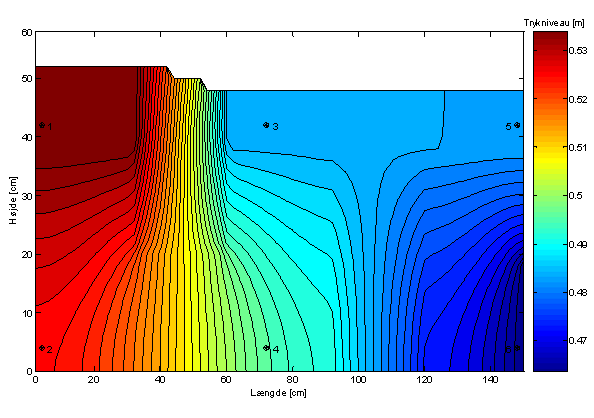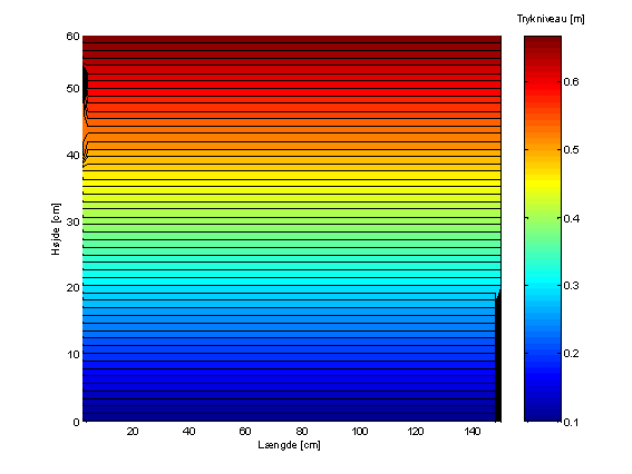 Figur 4 viser ud fra den konstante afstand mellem konturlinierne, at trykniveauet falder lineært fra randbetingelsen på 0,65 m i kassens venstreside til randbetingelsen på 0,62 m i kassens højreside. Dette indikerer, at modellen behandler Darcy’s lov korrekt.