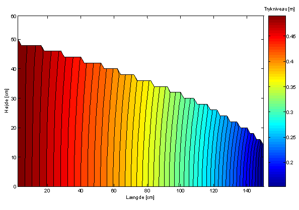 På Figur 5 ses det, at trykgradienten stiger fra randbetingelsen på 0,5 m i sandkassens venstreside til randbetingelsen på 0,15 m i sandkassens højreside. Dette er et udtryk for, at den samme mængde vand skal passere et aftagende strømningsareal.