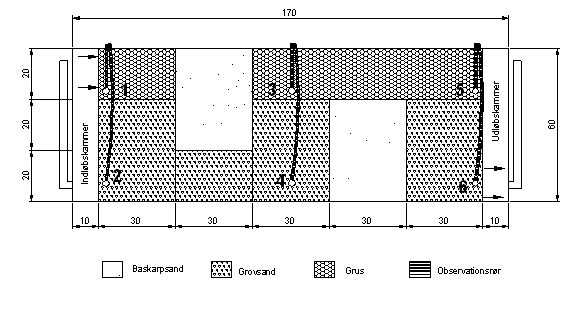 Som beskrevet tidligere er formålet med modellen at beskrive vandtransporten i sandkassen samt at bestemme den hydrauliske ledningsevne for grus, grovsand og baskarpsand. Dette er gjort ved, at anvende de hydrauliske ledningevner som kalibreringsparametre. Fordelingen af de tre jordtyper i sandkassen er angivet på Figur 6.