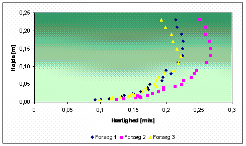 På Figur 4 ses de 3 hastighedsprofiler, som er målt i de 3 forsøg.