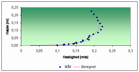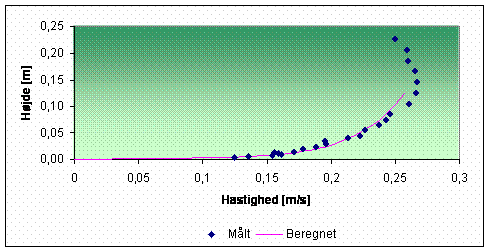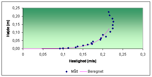 Der er målt hastighedsprofiler ved 3 forskellige strømningshastigheder. Profilerne er målt 7 cm fra den ene væg i strømningsrenden. Hastighedsprofilerne er anvendt til bestemmelse af bundforskydningsspændingen i strømningsrenden.
